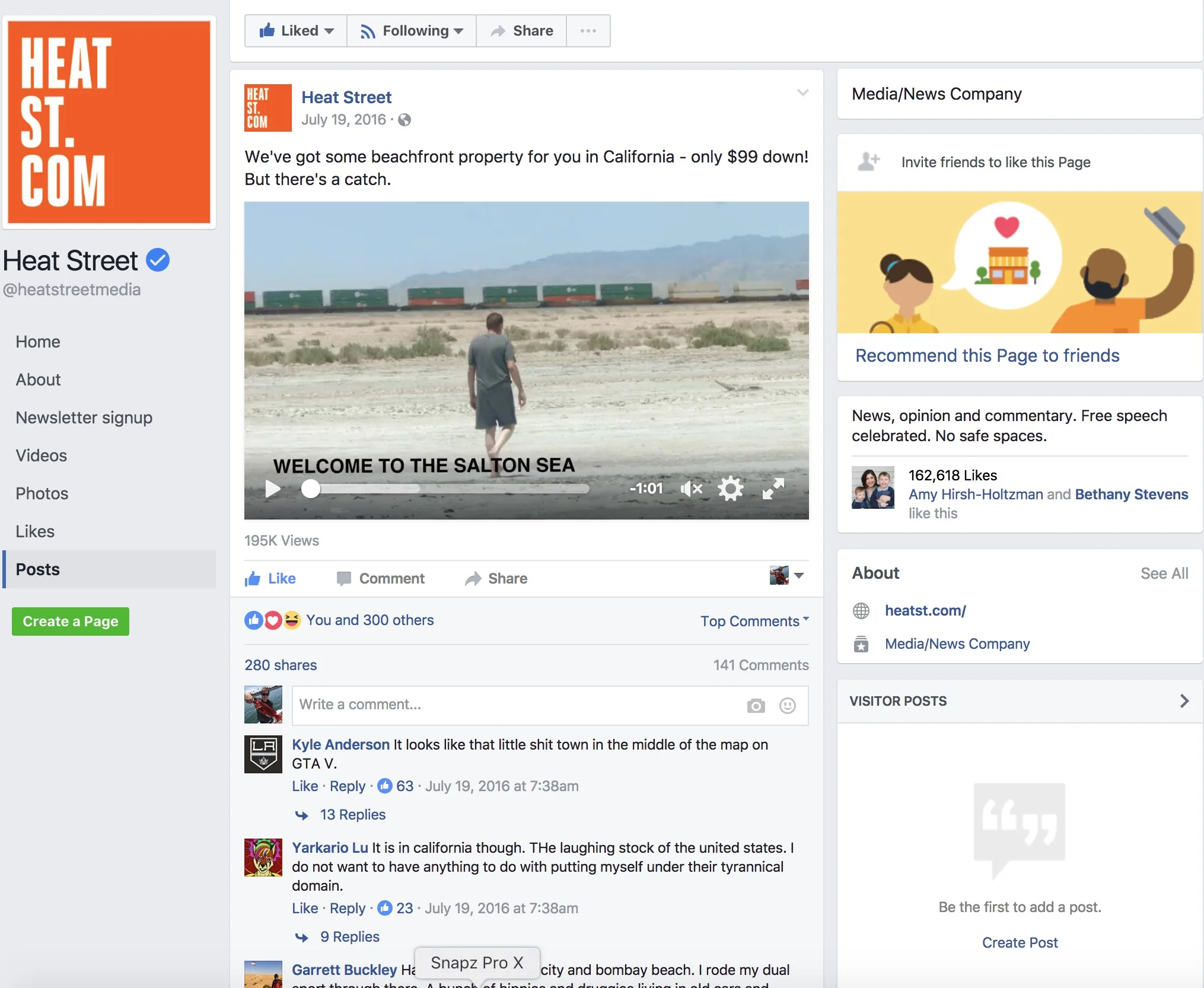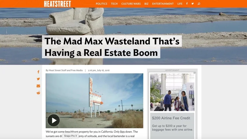 We produced a feature about the real estate boom happening in the post-apocalyptic wasteland know as the Salton Sea. The features were a huge success for the website as well as their social media properties resulting in hundreds of thousands of views, shares and comments. In addition to the main feature for heatst.com there were 2 social media cuts for Facebook and Twitter as well as a bonus cut about undocumented immigrants buying real estate without a social security number. Heat Street has grown to over 8 million unique visitors in just 6 months.